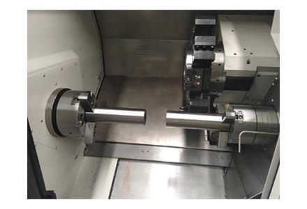 2)主軸箱及副主軸箱采用電主軸結構,主軸轉速高,剛性好,動態(tài)響應快,提高了加工圓度和表面的精度。對列式雙電主軸結構可在高速旋轉的情況下進行工件交換,配合12工位伺服刀架,可實現對工件的全部或大部分工序的加工,很大程度上節(jié)省了裝夾和加工時間,提高了加工效率。雙C軸功能可在任一主軸上進行工件分度和曲面插補加工。